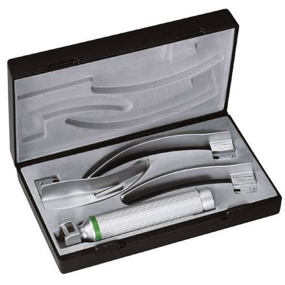 Estuche Laringoscopio Riester Ri-Integral, láminas curbas Mac Intosh 2,3,4 F.O - Luz al vacío 2,7 V - Acero inoxidable - Autoclavable a 134 °C - Ángulos redondeados