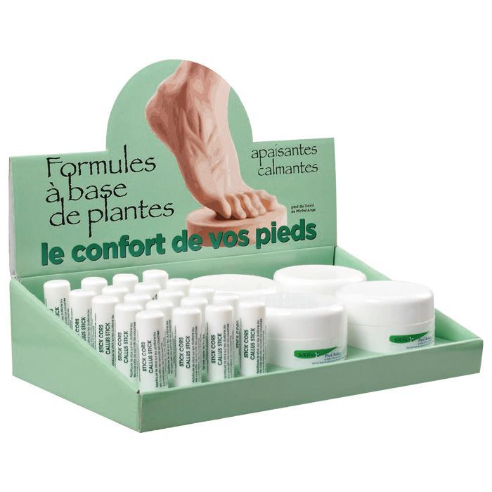 El expositor cuidado de los pies está compuesto de 16 sticks para los callos y de 4 botes pies relajo.