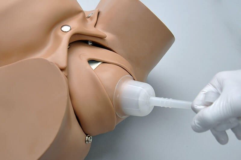 Representa un cráneo suave y liso con fontanela para el parto realista con extractor al vacío (ventosa).
