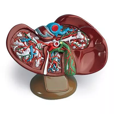La red compleja de conductos en el higado abierto representada en diferentes colores: