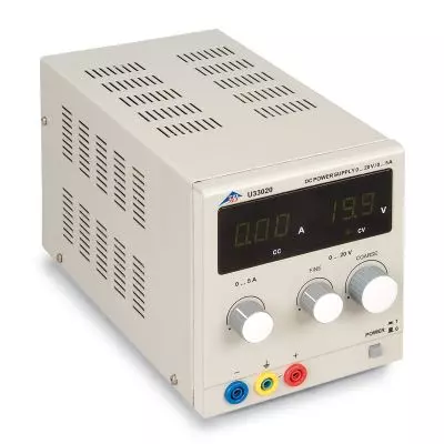 Fuente de alimentación de CC, 0-20 V, 0 - 5A (230 V, 50/60 Hz) U33020-230 - Tensión y corriente de salida ajustables sin saltos - Potencia de salida : 100 Vatios - Display : 2 x DEL a 3 posiciones