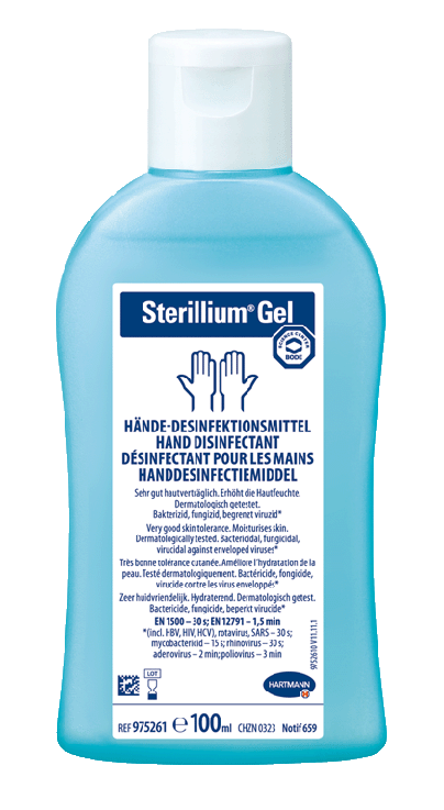 El gel desinfectante Sterillium Hartmann sirve tanto para la desinfección higiénica como para la desinfección quirúrgica. Es excepcionalmente bien tolerado por la piel, eficaz contra los virus envueltos y la mayoría de las bacterias en 30 sólo segundos.