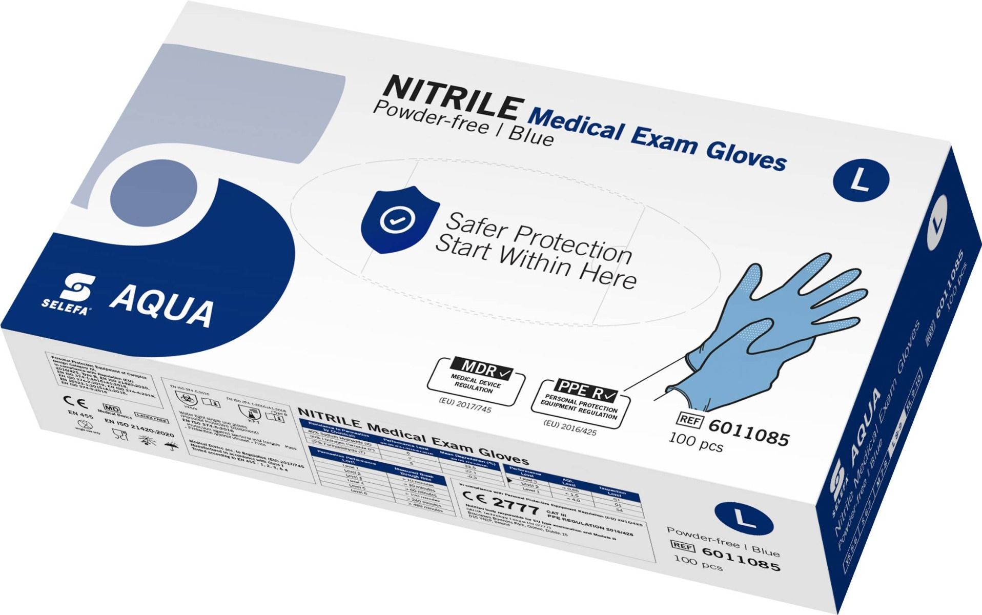 Conformes a las normas vigentes (EN 374, EN 16523-1), los guantes de nitrilo Aqua garantizan una barrera eficaz contra los riesgos biológicos. Su resistencia a la tracción (≥ 6 N) y su nivel de calidad AQL 1,5 atestiguan su fabricación controlada y su protección constante. Sin látex ni proteínas, reducen en gran medida el riesgo de reacciones alérgicas y son adecuados para pieles sensibles.