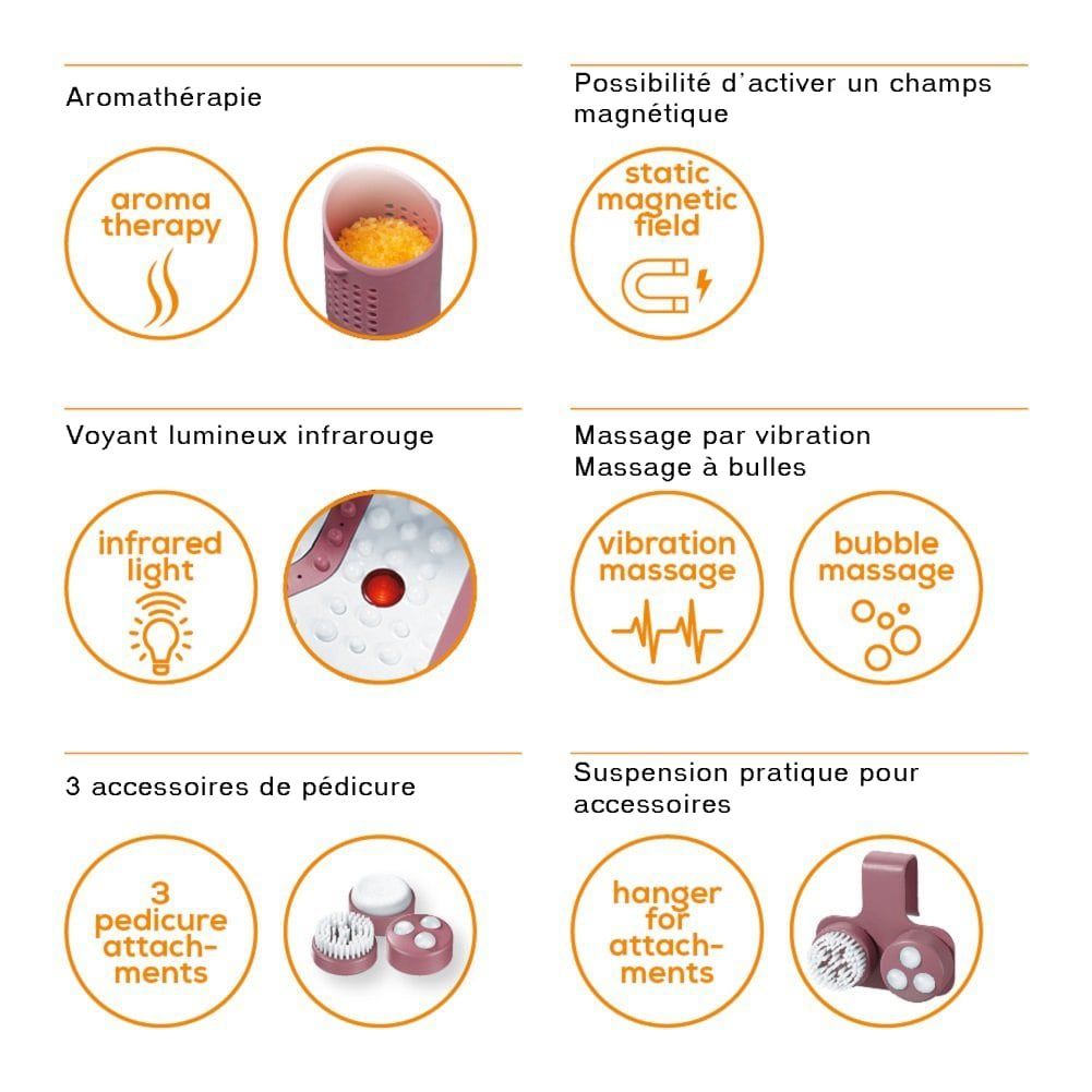 Este hidromasaje para pies dispone de rodillos desmotables para realizar masajes de reflexología podal y puntos de luz infrarroja; Sus paredes dobles permiten un mejor aislamiento térmico. Este dispositivo es verdaderamente práctico gracias a su asa para poder transportarlo y su protección contra salpicaduras extraible.
