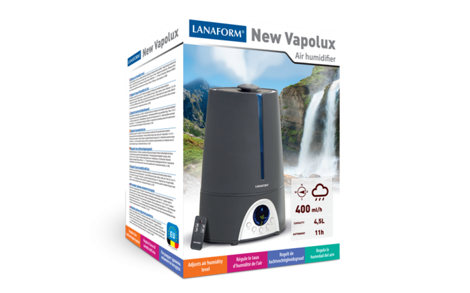Este aparato esta específicamente diseñado para humidificar el ambiente, cuando tiende a secarse, especialmente en invierno con la introducción de la calefacción. Cuando la humedad del aire es demasiado seca, ésta puede tener un impacto sobre nuestro sistema respiratorio o nuestra piel, por lo que es importante restablecer el aire con una cantidad normal de agua. El Humidificador Vapolux de Lanaform con vapor de agua fría permite igualmente combatir el aumento de la carga electrostática en el aire.