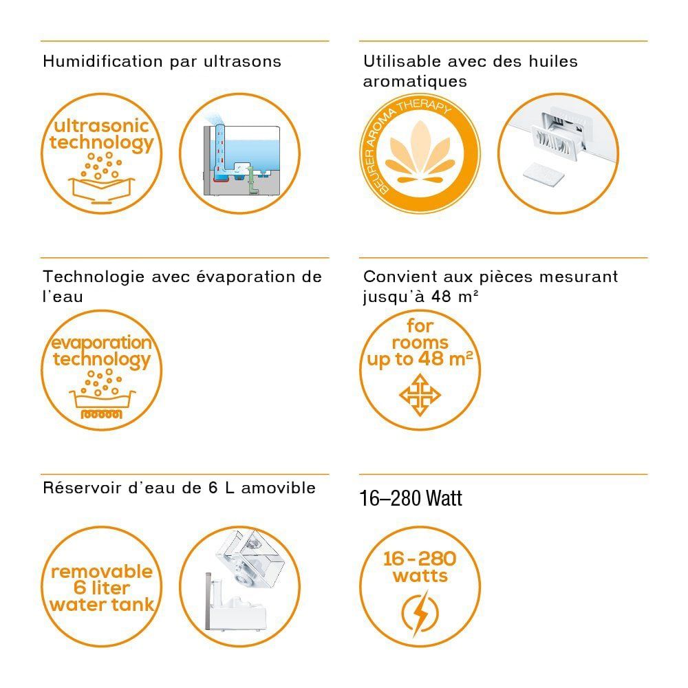 | - Nebulizador ultrasónico continuo, evaporador de aire conectable en 3 niveles | - Filtro para aguas duras disponible como opción |