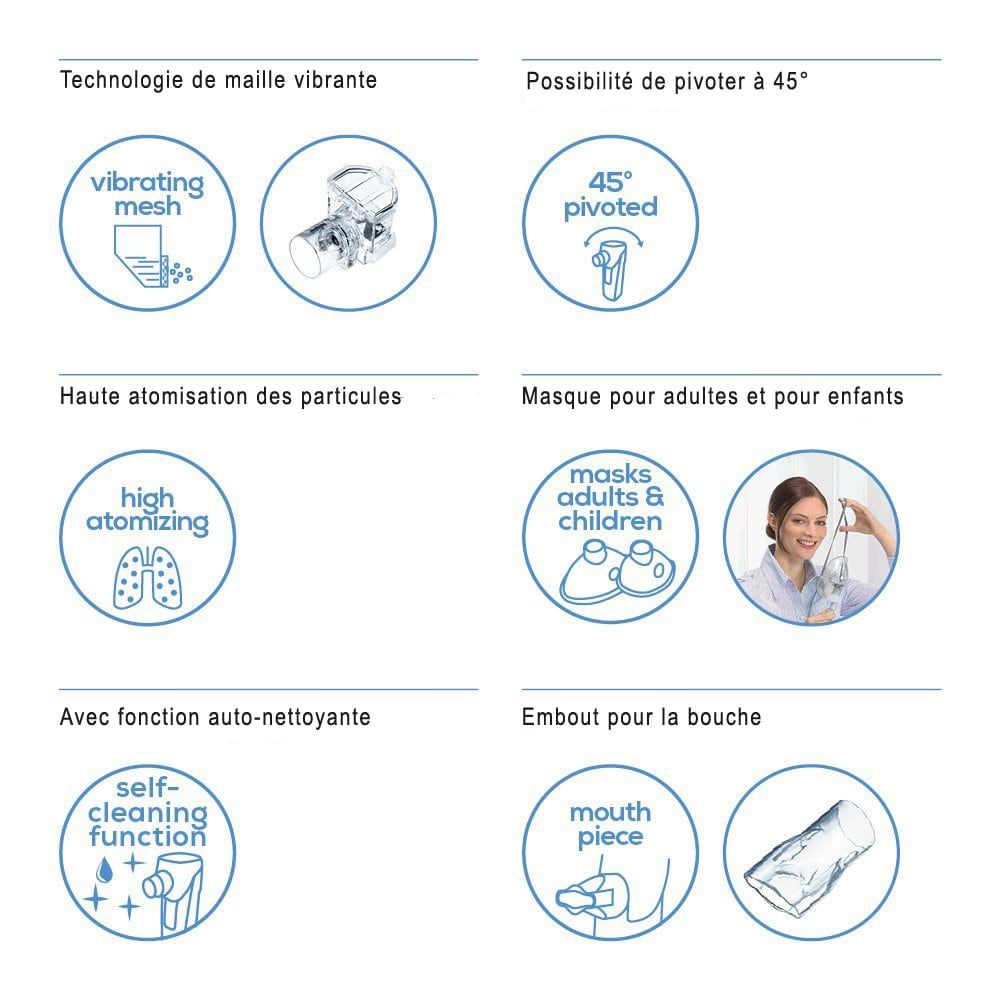 El nuevo inhalador eléctrico Beurer IH 55 posee una tecnología de membrana oscilante que le va permitir realizar una nebulización lo más óptima posible ya que hasta las partículas más pequeñas del medicamento pasarán a través del aparato gracias a esta. El aparato inhalador posee una alta capacidad de nebulización (>0,25 mL/min) por lo que permite que se realice una inhalación rápida y sobretodo eficaz para los niños y las personas con problemas de respiración. El nebulizador Beurer IH 55 se puede utilizar en caso de resfriado, asma y enfermedades de las vías respiratorias ya que la maquina puede tratar tanto las vías respiratorias inferiores como las vías respiratorias superiores.