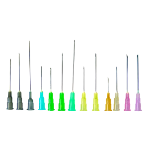 En acero inoxidable, triple bisel. Embase en polipropileno translucido con colores estándares permitiendo una identificación rápida de la aguja.