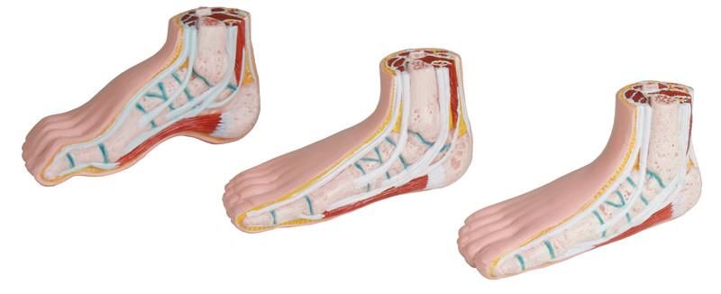 Estos 3 pies están cortados en el inicio de la pierna y presentan también un corte sobre el lado izquierdo que permite observar la anatomia del pie con los huesos, los músculos y ligamentos visibles. Esta herramienta didáctica es perfecta para los estudiantes y profesores de medicina, así como para los profesionales de la salud que quieran ofrecer demostraciones más explícitas a sus pacientes.