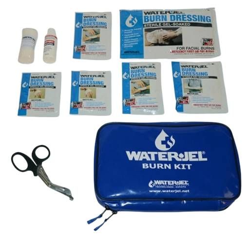Incluye varios apósitos impregnados con gel refrigerante Water-Jel, una mascarilla facial, un bote de gel compresible, un vendaje y unas tijeras, todo ello guardado en una bolsa modular azul. Los apósitos proporcionan un alivio instantáneo del dolor, ralentizan la progresión de las lesiones y protegen la zona afectada gracias a su textura no adherente.