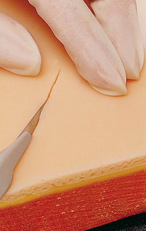 La piel artificial, resistente y flexible a la vez, permite el uso de grapas y pegamento quirúrgico además de las herramientas de sutura básicas para realizar suturas superficiales, profundas o subcutáneas. El cojín está compuesto por varias capas para garantizar un máximo realismo: epidermis, dermis, grasa y músculos.