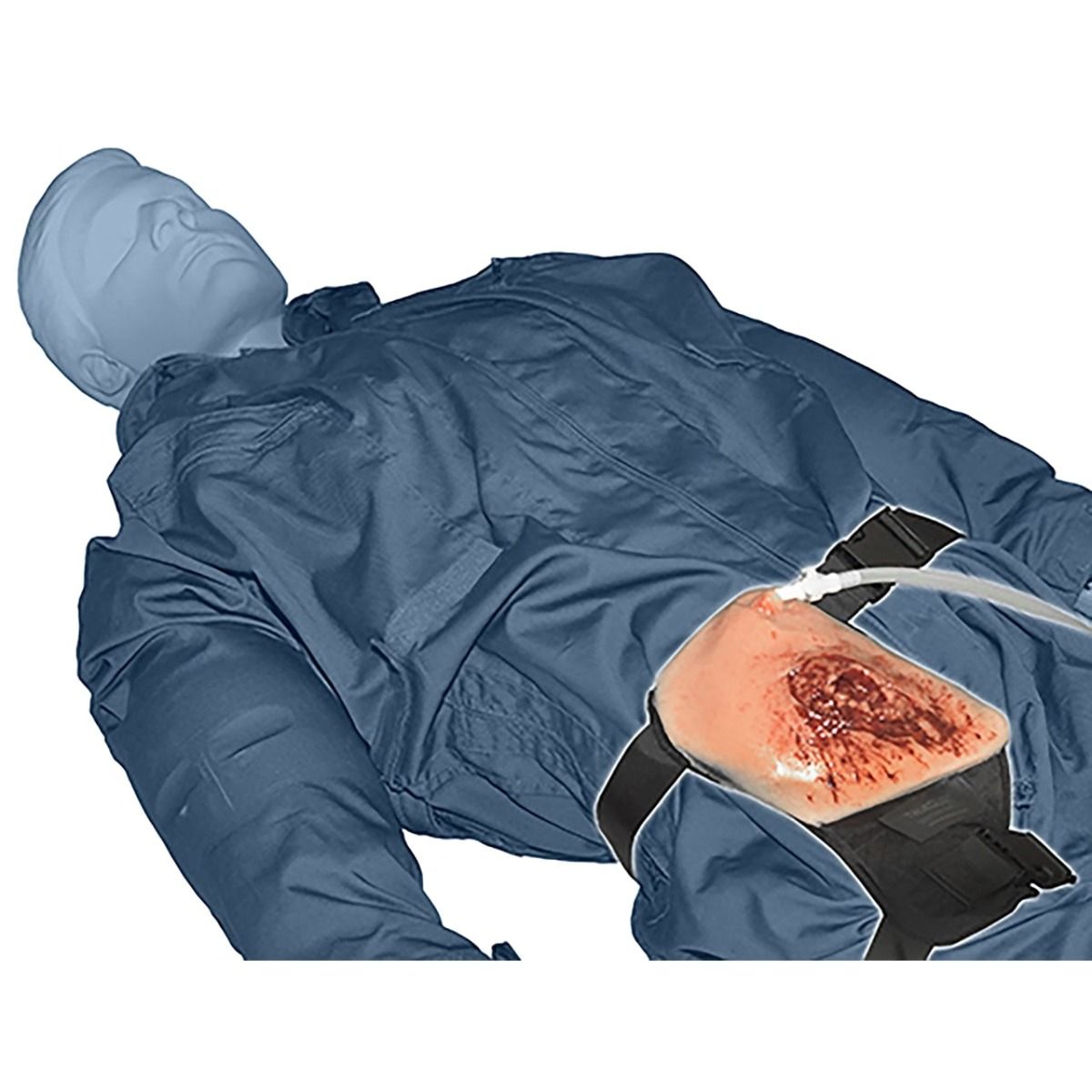 Adecuado tanto para un maniquí como para un instructor que desempeñe el papel de la víctima, este simulador inmersivo es ideal para sesiones de medicina táctica, militar o prehospitalaria. Incorpora una herida inguinal compresible, suministrada con sangre de entrenamiento por una botella flexible conectada por un tubo de conexión rápida.
