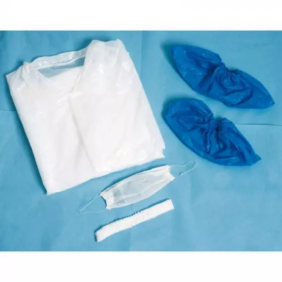 Este kit de ropa desechable KVR-01 LCH contiene protecciones de excelente calidad creadas para equipar a las personas que vienen del exterior y evitar así posibles infecciones tanto para el visitante como para el paciente. El kit contiene un gorro, una máscara, una bata y un par de cubrezapatos, todos de un sólo uso para garantizar una higiene extrema. De talla única, este kit también puede ser útil en la industria alimentaria.