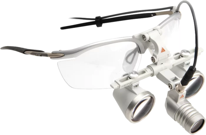 El kit de lupa frontal con lámpara LoupeLight 2 Heine consta de: