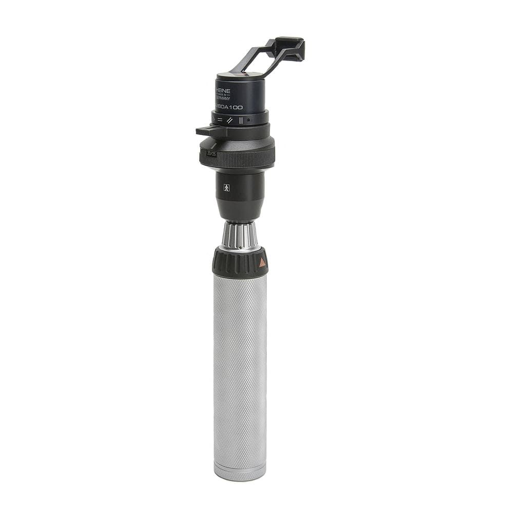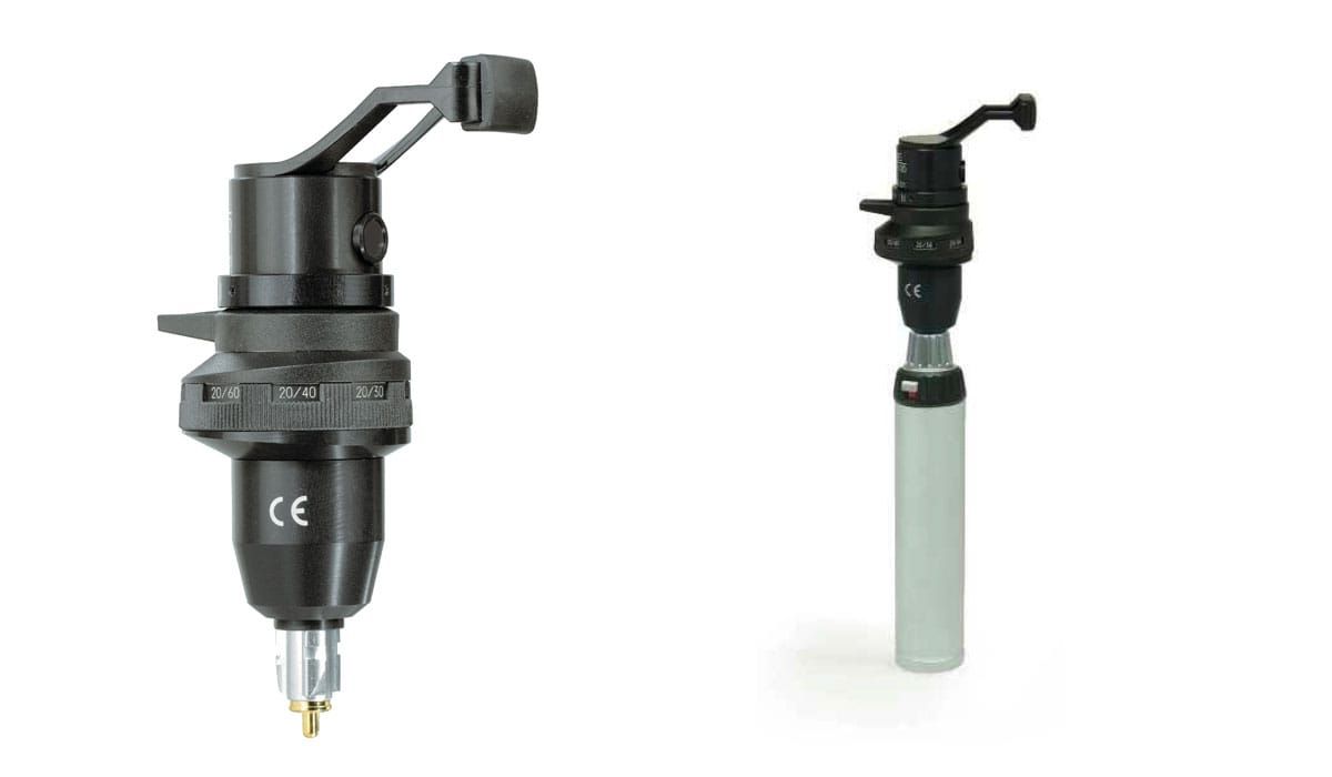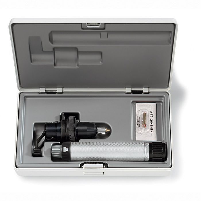 Kit Retinómetro Heine LAMBDA 100 2,5V con mango a pilas Escala 1 - Escala decimal 0,06 a 0,8 - Lámpara: Xenón Halógena XHL - Potencia de la iluminación: 2.5 V - Garantía: 5 años.