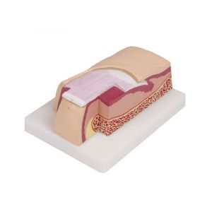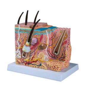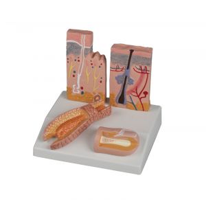 Este modelo altamente sofisticado muestra el corte de la piel humana tridimensionalmente. Las capas individuales de la piel son diferenciadas, y las estructuras importantes tales como vellos, glándulas sebáceas y sudoríparas, receptores, nervios y vasos se aprecian con gran detalle. Viene montado sobre una base.