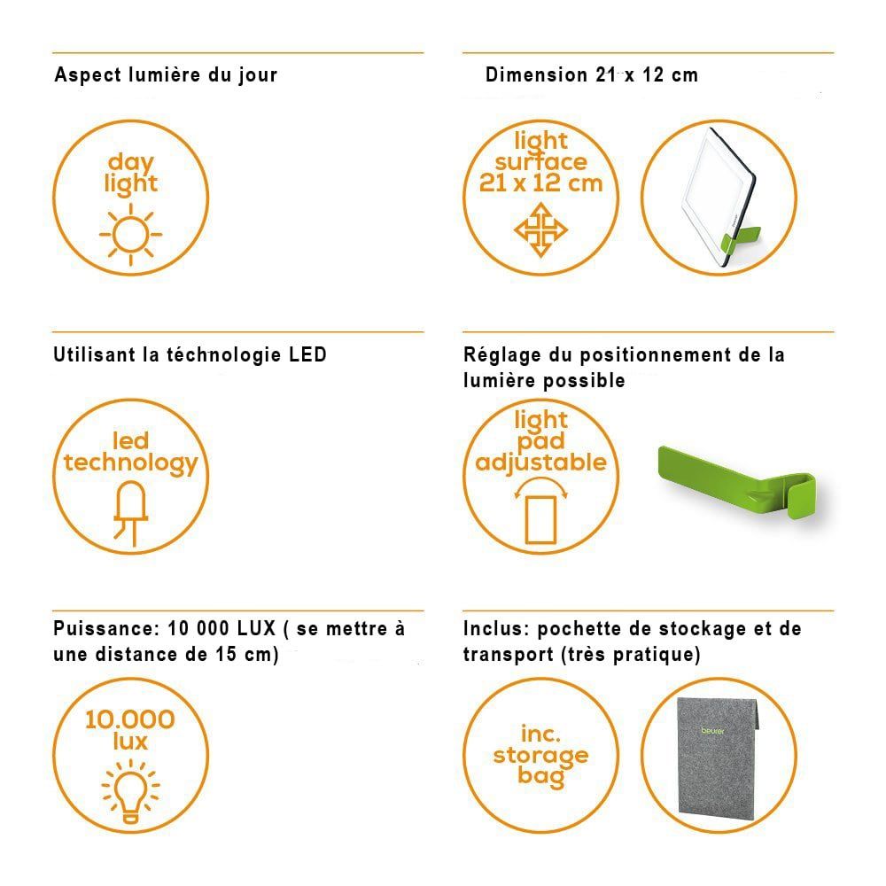 Este dispositivo es un producto médico certificado. Sin parpadeo y sin rayos UV lo que evita una exposición peligrosa, esta lámpara de fototerapia tiene una superficie de 20 x 12 cm. que proporciona una iluminación muy clara y uniforme.