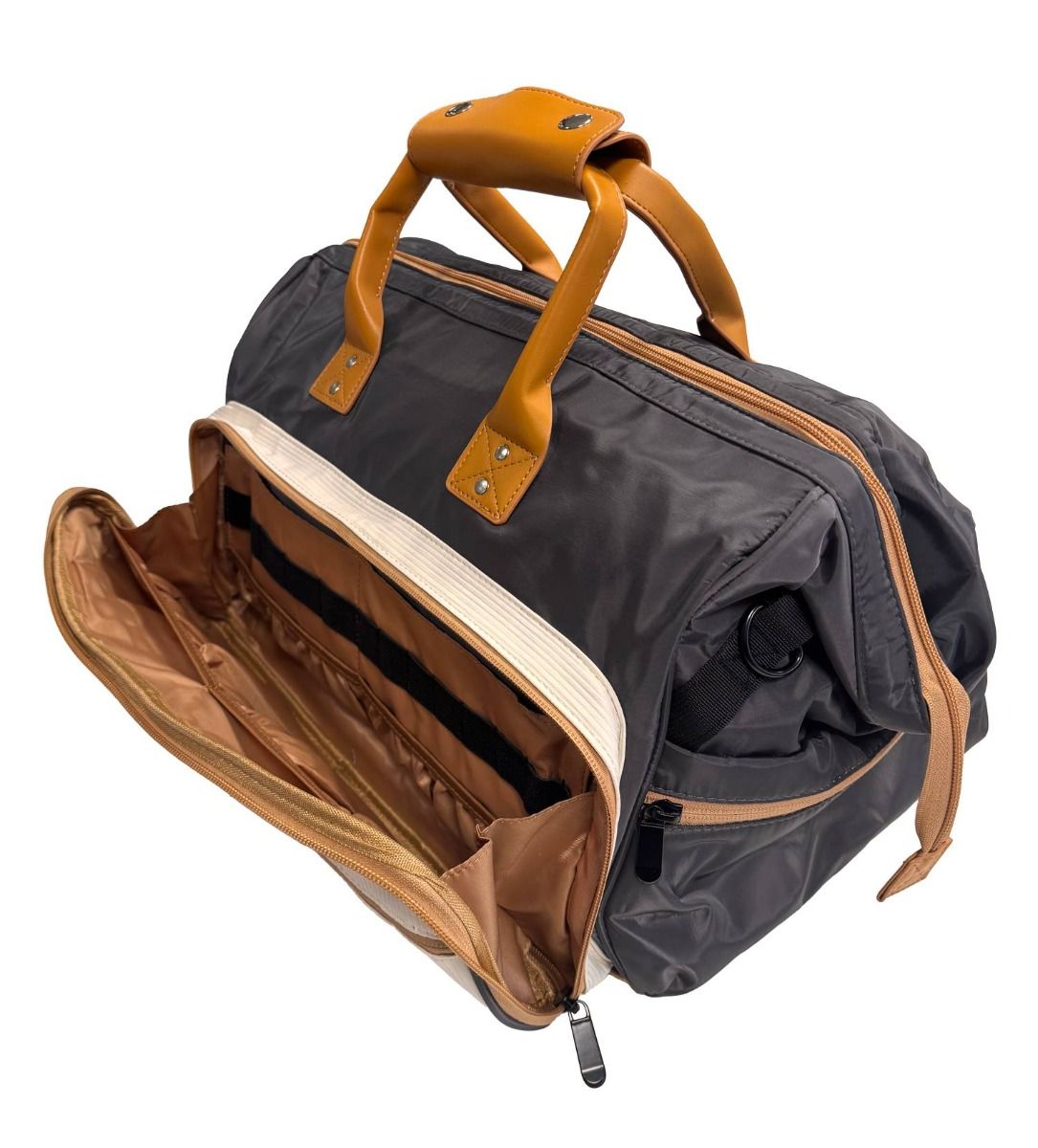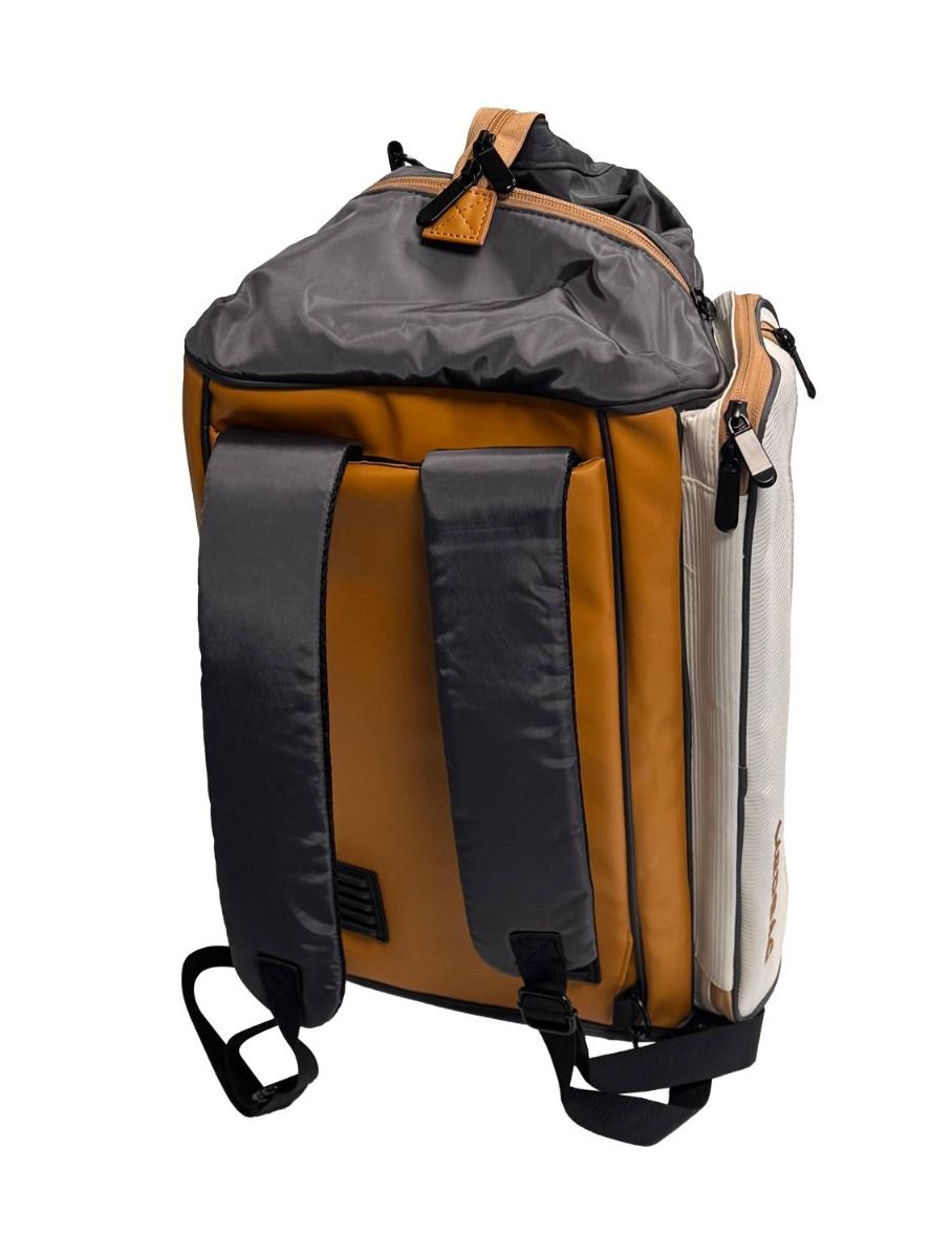 Dispone de tres opciones de transporte: una mochila para tener las manos libres, una bandolera para un uso rápido o un bolso de mano con asa de piel para mayor elegancia. Los materiales resistentes al agua y los refuerzos de goma garantizan una protección duradera contra los caprichos del terreno.