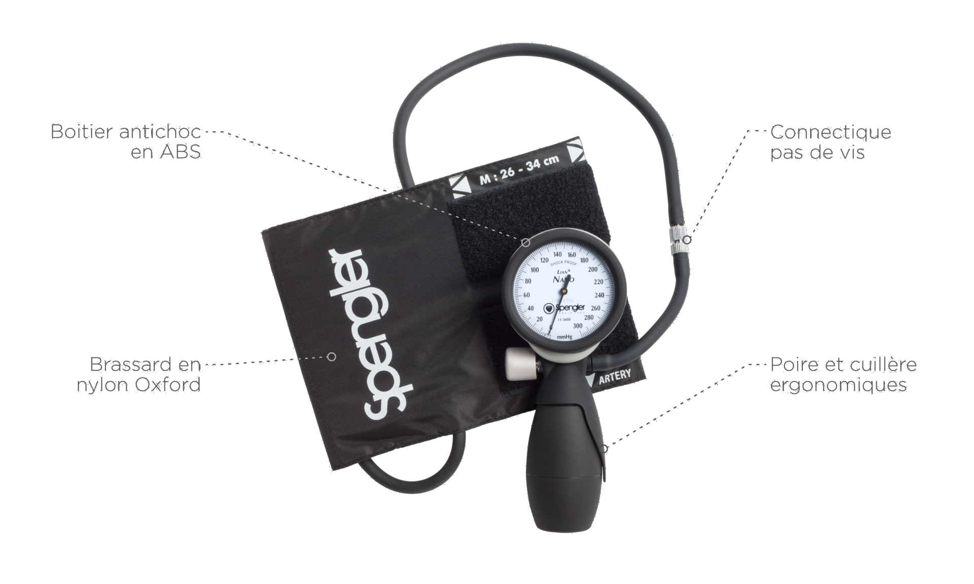 El tensiómetro mecánico Lian Nano de Spengler es un dispositivo médico ligero (pesa menos de 150 gramos) que ofrece un alto rendimiento, gracias a su diseño en ABS, un material que combina resistencia y ligereza. Esto lo hace práctico y fácil de transportar, al tiempo que garantiza una lectura precisa y fiable de la tensión arterial.