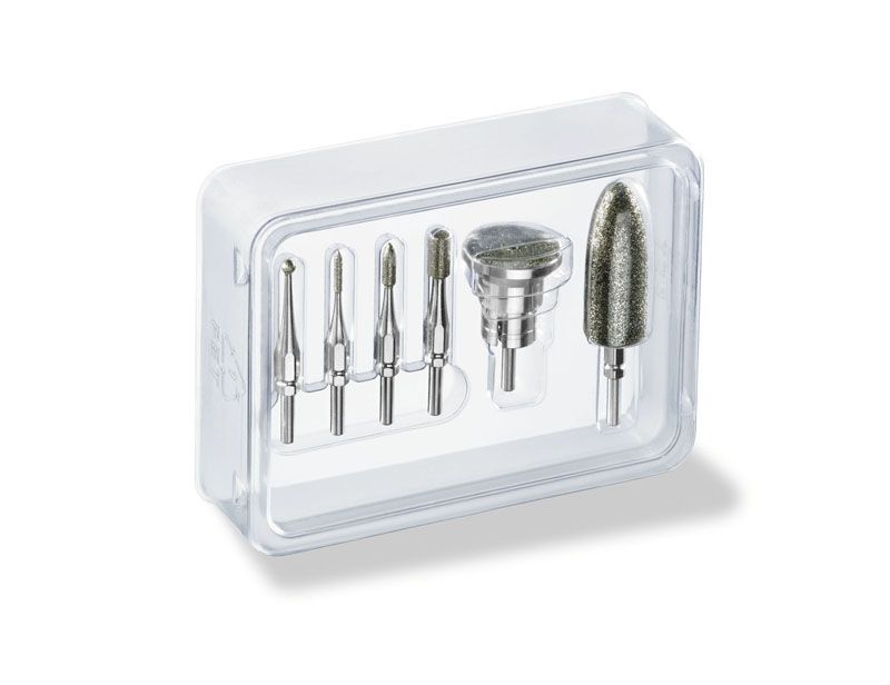 | - El set puede integrarse al set MP60 | - Fresa cilíndrica: Esmerila y suaviza las superficies secas de las uñas de los pies |