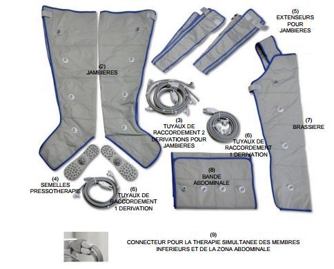 Este equipo de presoterapia se encuentra disponible en diferentes versiones dependiendo del equipamiento de base que usted desee. Debe tener en cuenta que cada modelo comprende el cuerpo de la máquina de presoterapia y sólo serán los accesorios los que diferenciarán una versión de la otra.