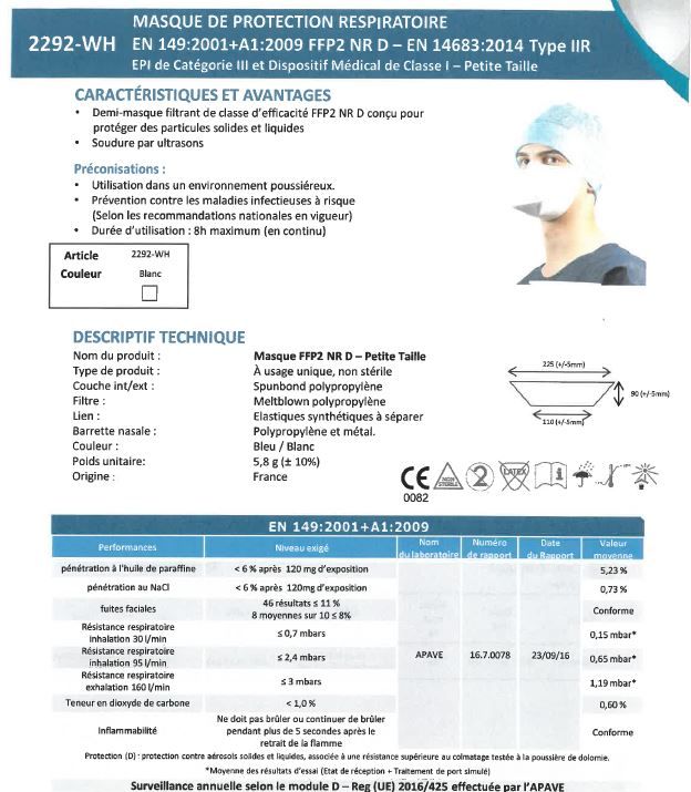 Mascarilla filtrante de categoría FFP2 dedicado a proteger contra los riesgos de inhalación de agente infecciosos transmisibles por vía aérea (tuberculosa, SRAS, gripa porcina…), no protege contra las vapores, los gases, los solventes o las atmosferas con un tenor en oxigena inferior a 17%. El utilizador debe ajustar correctamente el mascarilla porque la presencia de huidas hace la protección ineficaz.