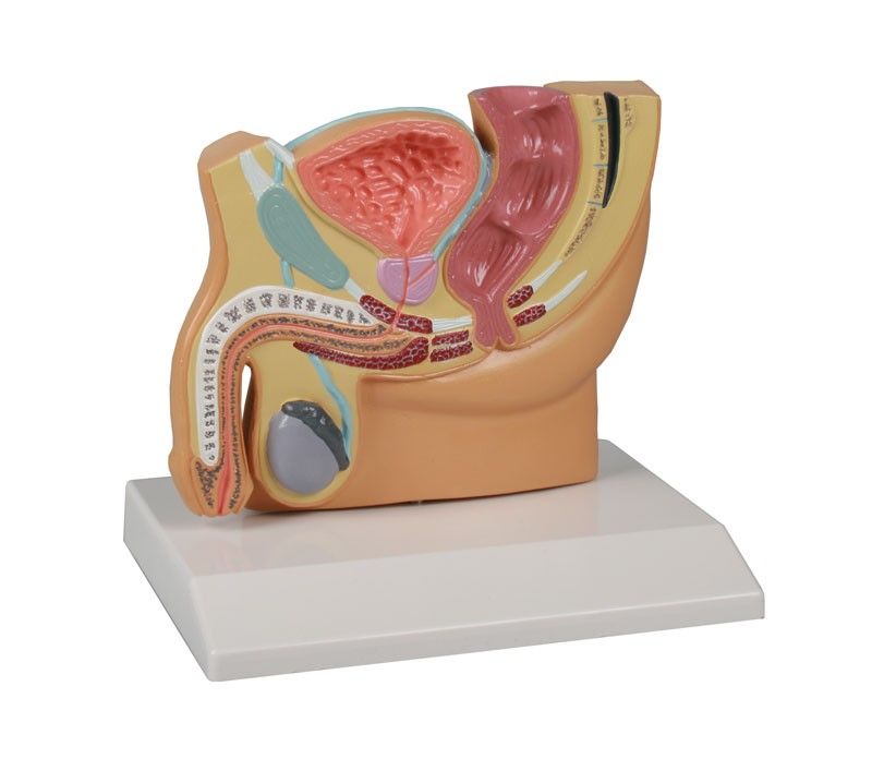 Este modelo de media pelvis masculina reducida H221 Erler Zimmer presenta numerosos órganos del aparato digestivo y genital masculino. Al contrario que la pelvis femenina, la pelvis masculina es más alta y menos amplia. Sobre este modelo están representados el pene, los testículos, la vejiga, la próstata, el recto, varios músculos de la zona, y también una parte de la columna vertebral; todo a una escala de ½.