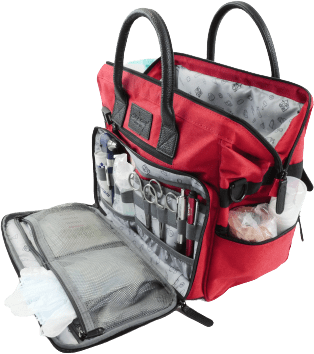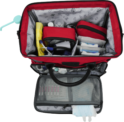 Reconocible por su color rosa-rojo, esta versión mini está destinada al uso en desplazamientos, para las visitas a domicilio o en primeros auxilios.