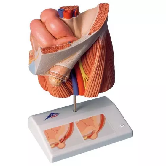 Modelo de hernia inguinal. Este modelo muestra en tamaño natural las estructuras anatómicas de la región inguinal de un varón con una hernia inguinal indirecta o externa, que aquí aparece abierta. Dos representaciones esquemáticas permiten la comparación entre una hernia inguinal directa (interna) y una hernia inguinal indirecta (externa). Este modelo facilita las explicaciones que recibe el paciente que va a ser sometido a una intervención quirúrgica. Sobre un zócalo.
