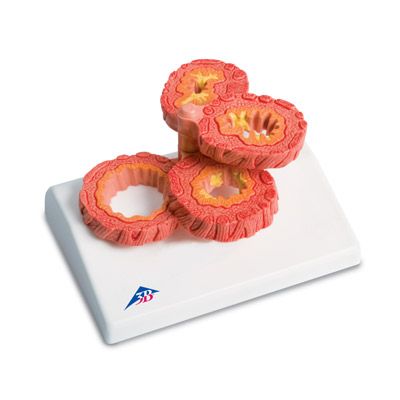 La EPOC es una enfermedad pulmonar crónica que conlleva la obstrucción progresiva de las vías respiratorias. Incluso mediante la administración de medicamentos, no se puede detener del todo la obstrucción El modelo nos muestra de forma evidente la obstrucción del tejido bronquial (de abajo hacia arriba):