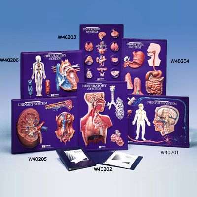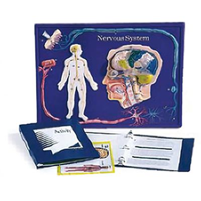 Representa las estructuras del sistema nervioso central y periférico, incluyendo el estudio del encéfalo humano con láminas transparentes desmontables para mostrar las características de los lóbulos cerebrales. Las representaciones esquemáticas muestran la ubicación del encéfalo, la médula espinal y los nervios espinales. Además están representados las dendritas, los axones y las sinapsis. Descripción en inglés.