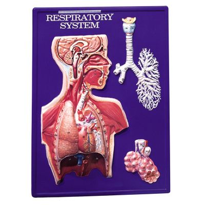Indicado para facilitar el conocimiento del tema de la respiración y de la complejidad anatómica de las vías respiratorias. Incluye la representación seccionada del tronco humano con la cabeza, además de una representación aumentada del árbol bronquial y una representación muy aumentada de los alvéolos en una sección parcial. Descripción en inglés.