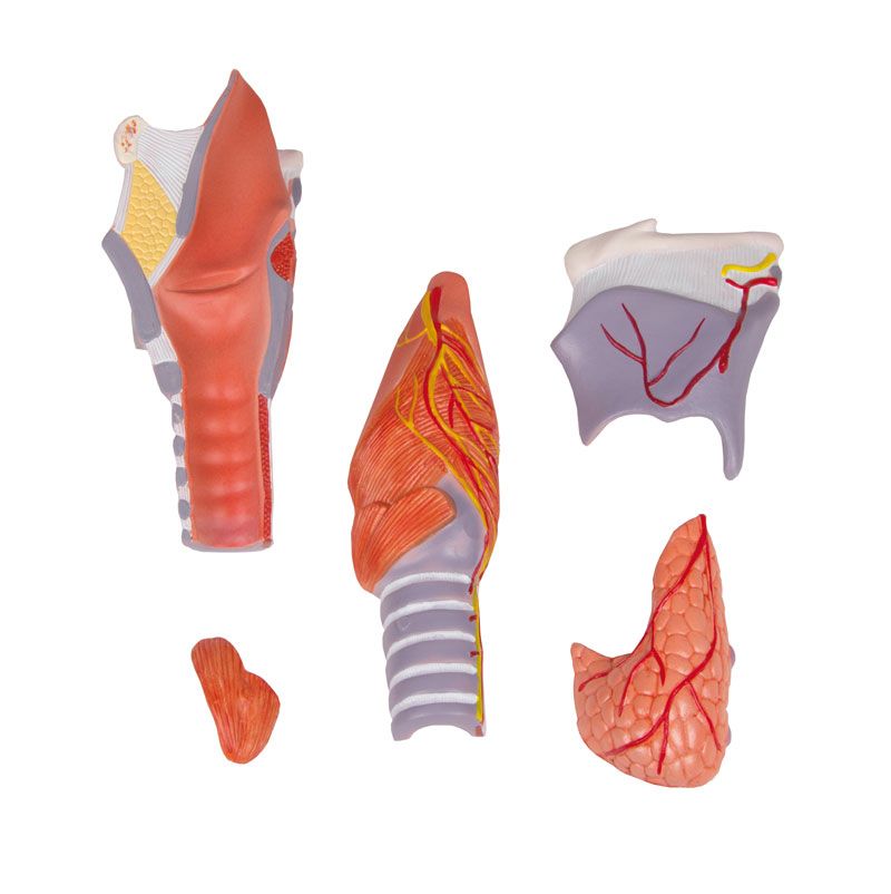 El modelo tiene un corte en el centro para poder observar la estructura interna del órgano, como el hueso hioides, cartílago, ligamentos, músculos, vasos, nervios y la glándula tiroides. Las partes extraíbles son, en el lado izquierdo, la mitad del hueso hioides, el cartílago tiroides y la mitad de la glándula tiroides. En en lado derecho, el músculo cricotiroideo también se puede retirar.