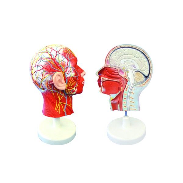 Este modelo a tamaño real de la marca Mediprem muestra la parte derecha de la cabeza y el cuello humano. Este modelo de media cabeza humana se corta en el plano sagital, lo que permite estudiar las estructuras internas con más detalle, es decir, la composición del cerebro interno, la faringe, las vías respiratorias superiores y una parte de las vértebras cervicales.