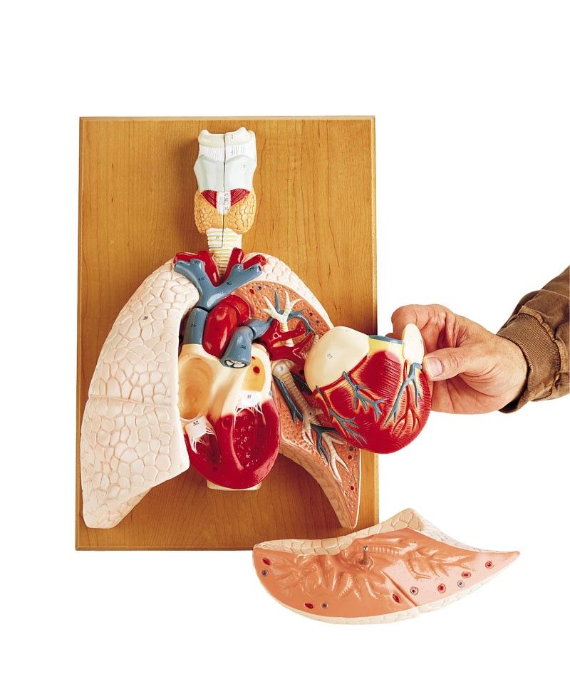 La parte derecha de la laringe, la mitad del corazón y la mitad del pulmón izquierdo se pueden retirar para observar la estructura interna con, entre otros, la bifurcación de la tráquea, el árbol bronquial, las arterias pulmonares y las venas. Al separar en dos piezas el corazón se pueden observar las 4 cavidades con sus válvulas, permitiendo una mejor y más fácil comprensión de la circulación sanguínea. La circulación sistémica y pulmonar también puede rastrearse fácilmente.