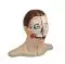 Este dispositivo puede separarse a la mitad, y la piel y los músuclos del lado derecho ha sido retirada para observar la estructura más profunda de la cara. Así es más sencillo analizar los diferentes aspectos de la estructura interna.
