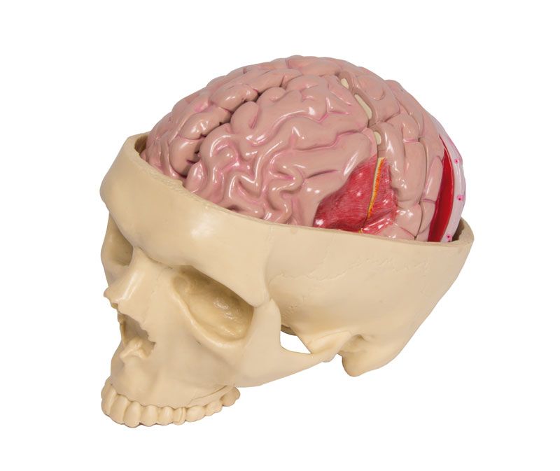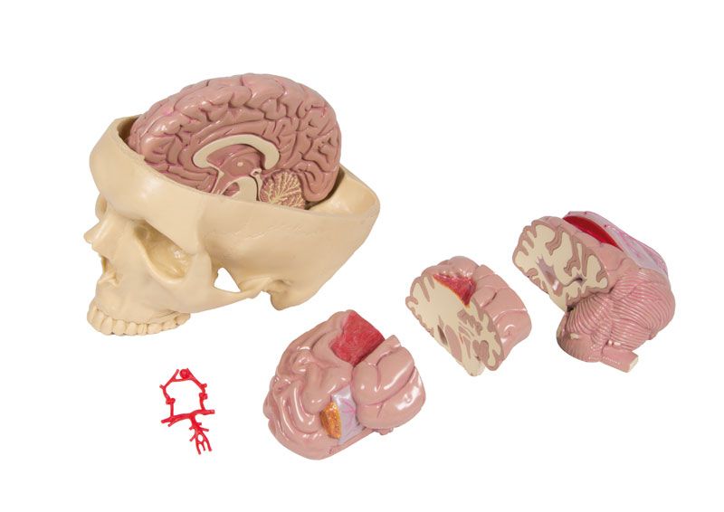 El Modelo de cerebro con enfermedades cerebrales Erler Zimmer consta de una base del cráneo con una mitad del cerebro sano y una mitad del cerebro desmontable en tres partes con diferentes patologías y el círculo de Willis.