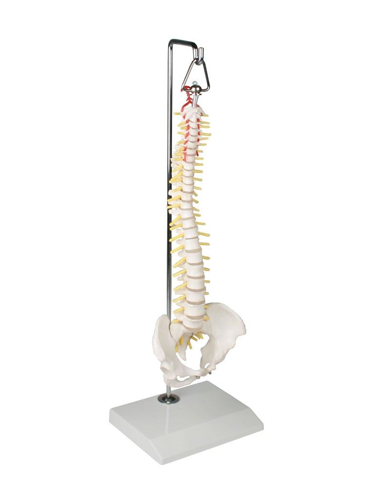 La columna vertebral humana es una superposición de vértebras que soportan la cabeza y se extiende hasta las caderas permitiendo la distribución eficaz del peso del cuerpo. Estas vértebras están conectadas por los discos intervertebrales, los cuales, por diversas razones asociadas a la edad y al esfuerzo, pueden desgastarse. Este modelo de columna vertebral en miniatura suspendida con pelvis 4002 Erler Zimmer es una representación a escala ½ de la columna vertebral humana.