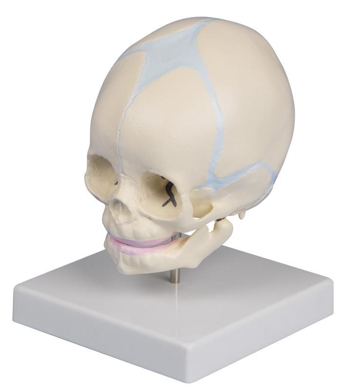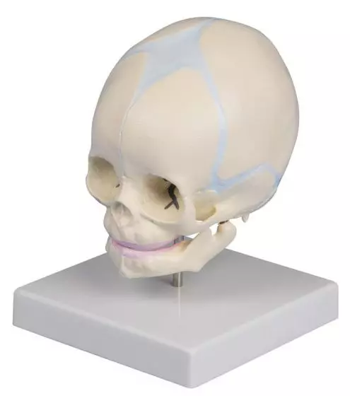 Perfecto para mostrar a los estudiantes de medicina y a los futuros padres la forma precisa de la cabeza de un feto de 30 semanas. Las fontanelas abiertas están visibles y destacadas en azul sobre la superficie, éstas no se cerrarán hasta el segundo o tercer año del bebé.