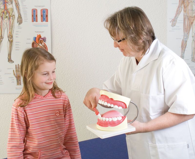 Modelo de cuidado dental, aumentado 3 veces Erler Zimmer - Útil para enseñar cómo correctamente cepillarse los dientes - El modelo viente con un cepillo de dientes de tamaño proporcional - Viene con la base