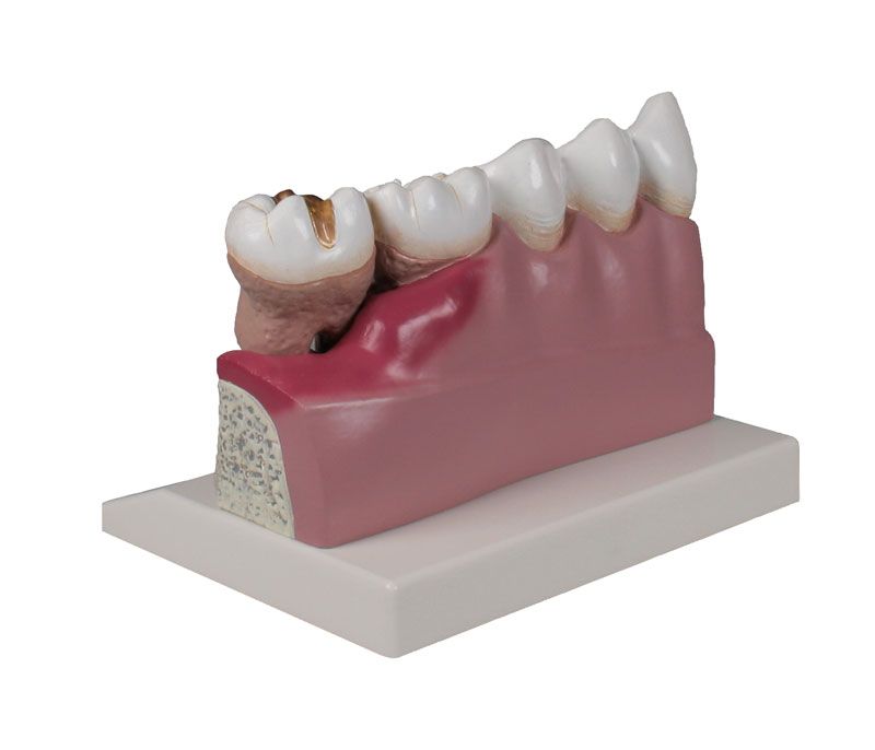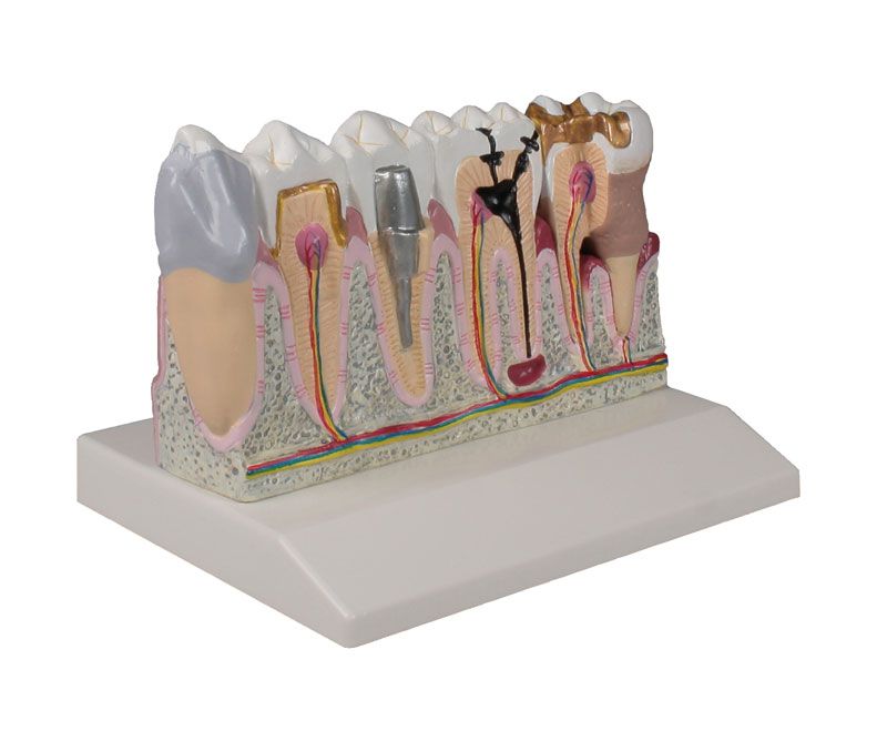 Este Modelo de dentadura inferior, aumentada 4 veces D250 Erler Zimmer presenta una parte de la dentadura inferior (dientes 3 a 7) en mal estado, con diferentes problemas que necesitan diferentes tratamientos. Se puede apreciar la presencia de caries, decoloraciones, irritaciones de raíces, sarro, periodontitis y dientes desvitalizados (dientes 3 y 5). Las soluciones de tratamiento visibles son: empaste, corona de metal / cerámica, perno e implantes de cerámica y oro.