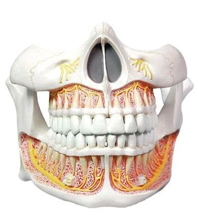 Esta maqueta muestra la estructura de los dientes de adulto y de los nervios de la mandíbula inferior. El maxilar y la mandíbula vienen abiertos con el fin de mostrar con precisión las raíces, los vasos y los nervios. Con una base de apoyo, este modelo anatómico de dentición de adulto puede articularse para así, realizar demostraciones como por ejemplo, la masticación.