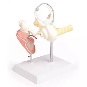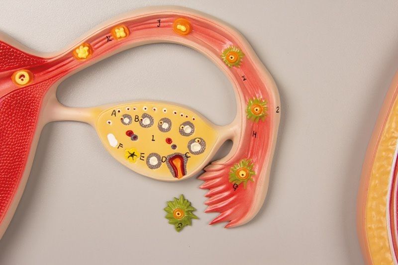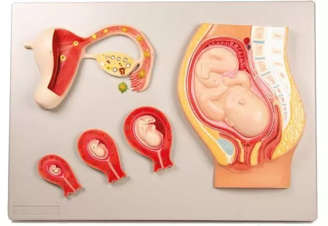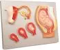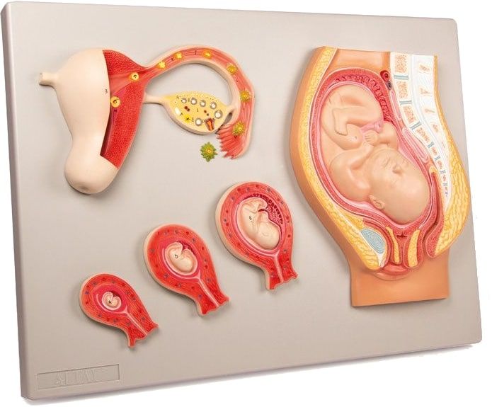 Compuesto por cinco elementos principales, está montado sobre un panel explicativo que ilustra momentos cruciales como la ovulación, la fecundación, la formación del cigoto y la implantación uterina. Las distintas fases del desarrollo fetal están cuidadosamente representadas: 2 semanas, 8 semanas, 12 semanas y 9 meses, ofreciendo una visión completa de las transformaciones biológicas y anatómicas.