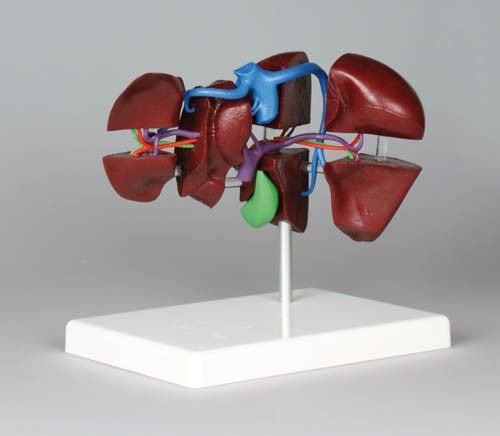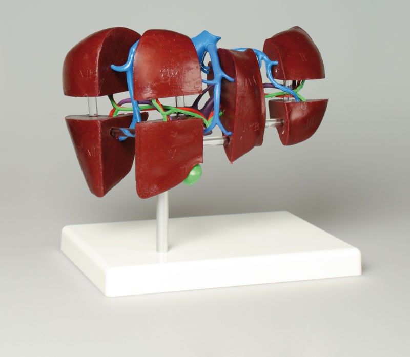 El hígado es un órgano vital voluminoso que asegura la función de filtrado de la sangre para liberar las toxinas del cuerpo. También juega un importante papel en la regulación del nivel de glucemia en el organismo. Este modelo reducido (75% del tamaño natural) del hígado, describe la anatomía segmentada del hígado según las investigaciones del anatomista francés Claude Couinaud.