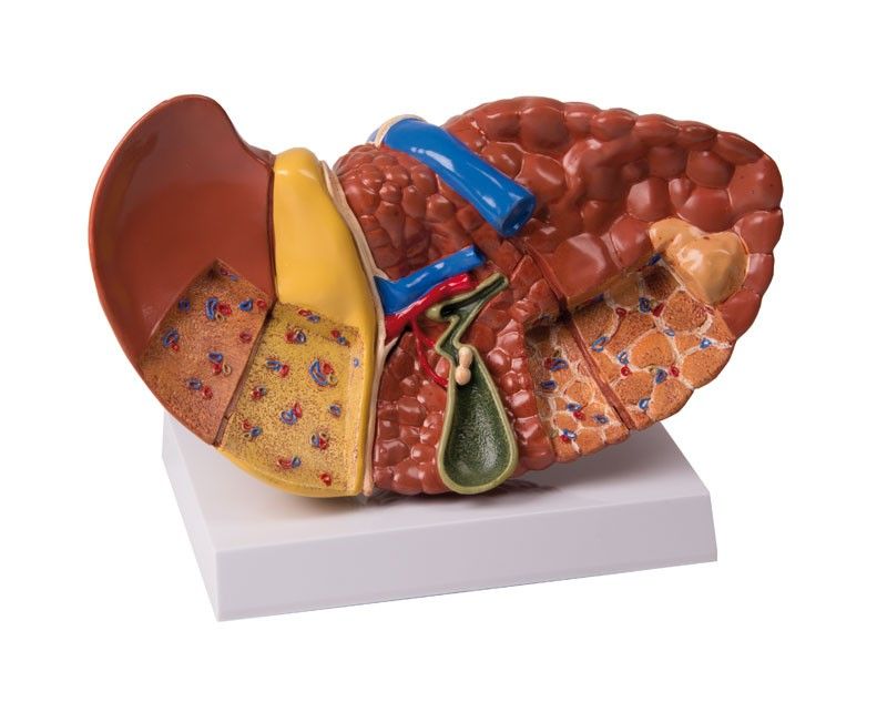 Cuando el hígado está enfermo, las consecuencias sobre el organismo pueden ser muy graves y en ocasiones puede ser necesaria la realización de una operación quirúrgica. Este Modelo de hígado enfermo K75 Erler Zimmer presenta diferentes patologías que afecta al hígado y a la vesícula biliar, como una cirrosis, una obstrucción biliar, cálculos en la vesícula biliar y diversos tumores.