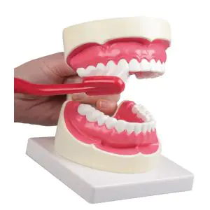 En este modelo se aprecia la mandíbula hasta el segundo molar, la lengua con musculatura del piso de la boca en el corte y la glándula derecha sublingual y submandibular. Desmontable, sobre soporte.