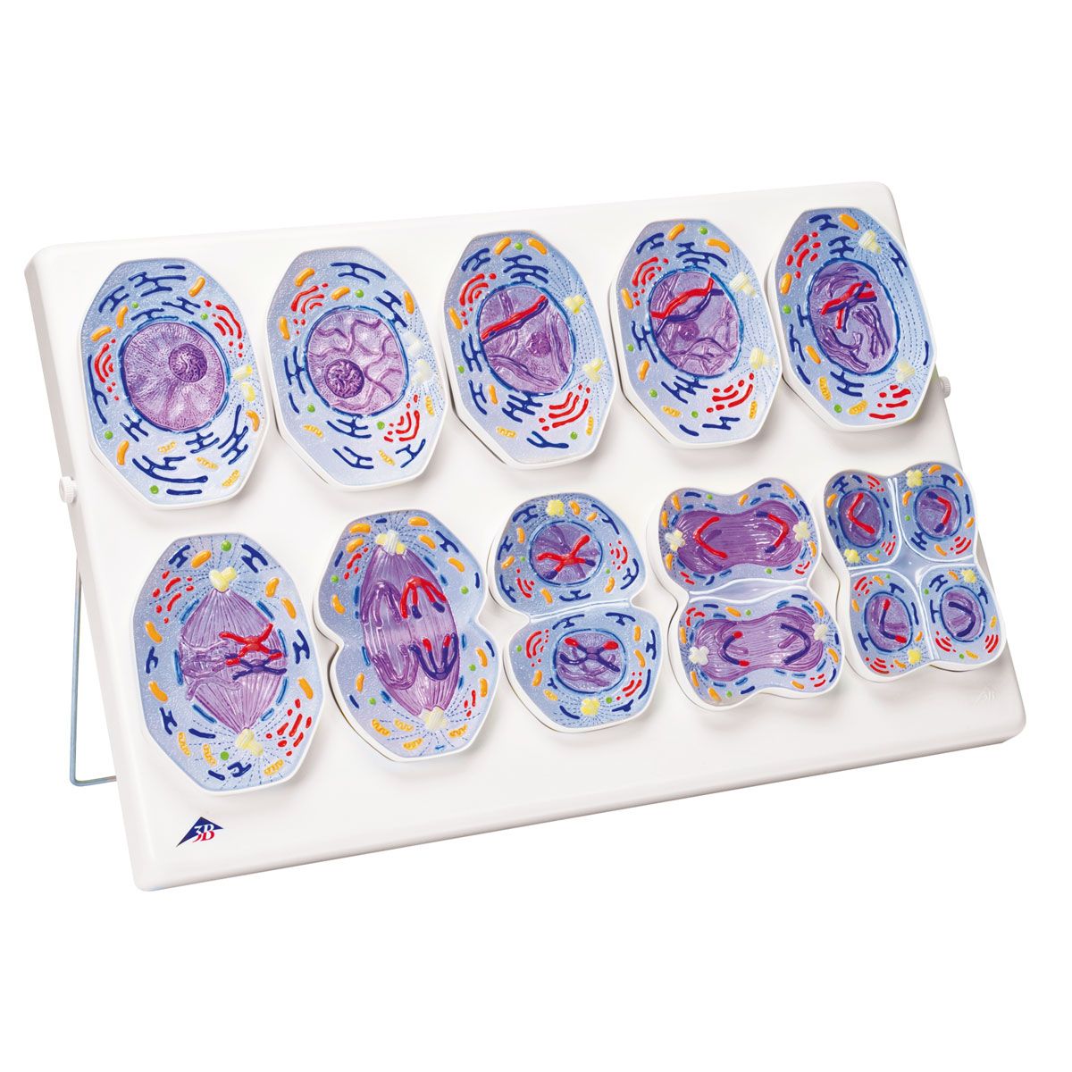Los modelos tridimensionales en relieve están pintados de acuerdo a los métodos de coloración actuales utilizados en microscopios que permiten entender fácilmente los procesos de la división celular. Los orgánulos celulares se muestran en su estado abierto en la parte inferior de los modelos. Los imanes situados en la parte posterior de los modelos, permite fijarlos y clasificarlos fácilmente sobre el tablero magnético durante el transcurso de la clase.