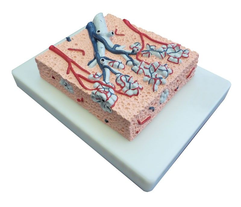 Este modelo de lóbulo pulmonar G420 Erler Zimmer representa un corte pulmonar aumentado 20 veces en el que están representados los bronquios, los bronquiolos y los alvéolos, además de los vasos sanguíneos. Se trata de un modelo didáctico perfecto para los estudiantes y profesionales de la salud que quieran apoyar sus explicaciones con una ilustración concreta de la estructura interna del pulmón, mostrando la ubicación donde el aire y la sangre termina en los pulmones.
