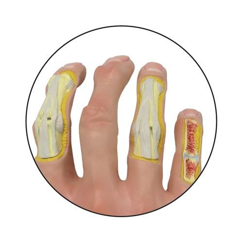 Este modelo de artrosis en la mano M25 Erler Zimmer es una representación a tamaño natural de la mano derecha afectada por varios síntomas de la artrosis. Un corte en la palma hace que sea posible observar los efectos sobre los trastornos de la estructura ósea tales como osteofitos (también llamado espolones óseos, formando un crecimiento anormal del hueso), nódulos Bouchard y Heberden, y una deformación en el cuello de cisne.