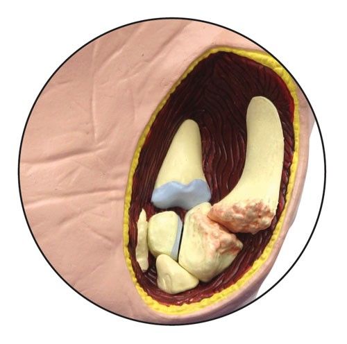 También se pueden ver el resto de estructuras indirectamente afectadas por la artrosis como ligamentos, tendones, músculos y cartílagos. El artículo incluye una base de sujeción y exposición, y un guía explicativa en inglés.